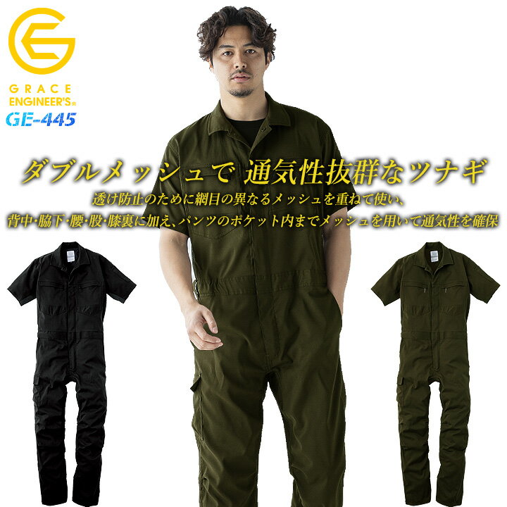 半袖つなぎ 吸汗速乾 ダブルメッシュ ストレッチ 夏用薄手生地 夏の一押しつなぎ GE-445 グレースエンジニアーズ 春夏 キャンプ アウトドア 作業服 作業着 エスケープロダクト【S-3L】
