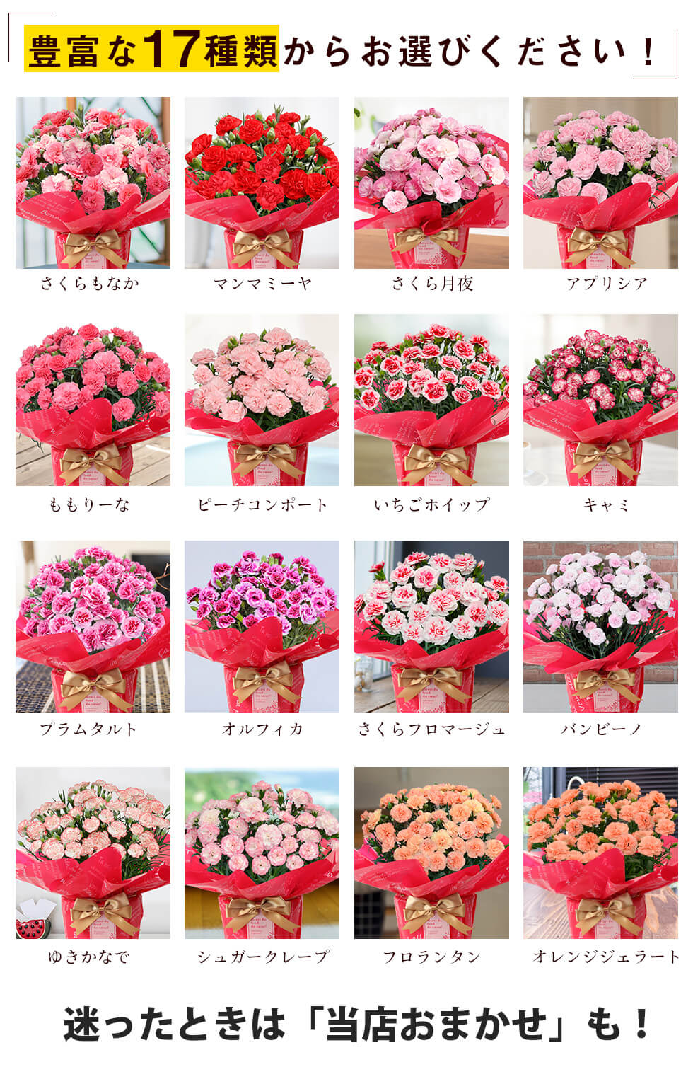 選べる17種類の「カーネーション」& 4種類の「スイーツ」 について カーネーションの種類 さくらもなか / マンマミーヤ / さくら月夜 / アプリシア / ももりーな / ピーチコンポート / いちごホイップ / キャミ / プラムタルト / オルフィカ / さくらフロマージュ / バンビーノ / ゆきかなで / シュガークレープ / フロランタン / オレンジジェラート / おまかせ / 全17種類 カーネーションのサイズ 鉢サイズ 5号サイズ (直径 約15cm) スイーツの種類 宇治抹茶カステラ (6切入り) はちみつカステラ (6切入り) 金澤栗きんつば (4個入り) 皇居周辺蜜(蜂蜜)バウムクーヘン(12個入り) 商品のお届けについて ご注文は1個毎にお願い致します。